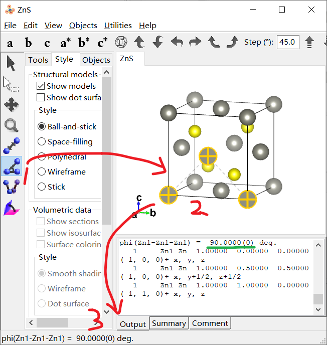 以测量原子夹角为例(图14),选择“角度”工具,然后依次选择三个原子,随后就能在Output里面获得原子夹角。二面角和界面角的测量类似,这里不再叙述。