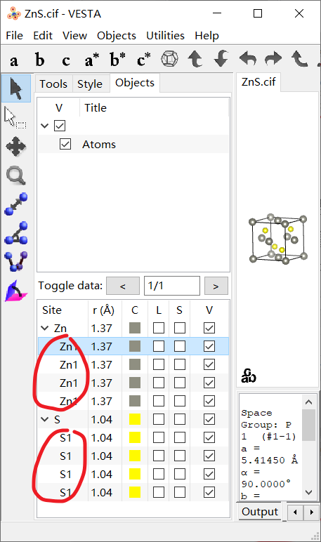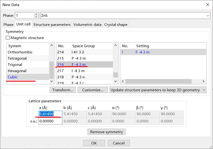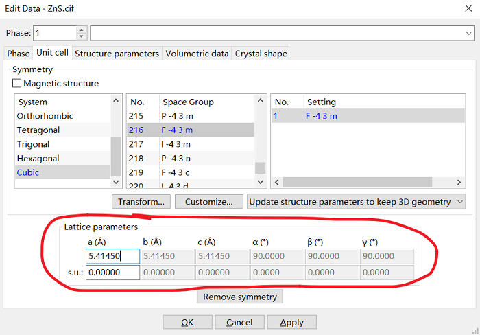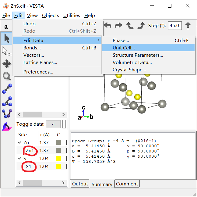 如图15所示,依次选择“Edit → Edit Data → Unite Cell”就可以打开“Edit Data”界面(图16),在图16红圈所示地方就可以对晶胞参数进行调整。这里只能对晶胞长度a进行调整,因为该例中ZnS是立方结构。