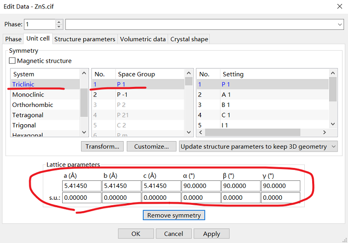 有时候为了方便对晶体结构进行修改,我们需要降低晶体的对称性至“P1”。从4.1中的图15和图16可以看出,由于对称性的存在,Zn和S原子只有一个等效位点且有些晶体点阵参数不能修改。为此,我们可以按照图17的方式通过“Remove symmetry”来去除晶体对称性。