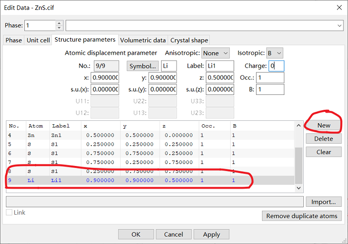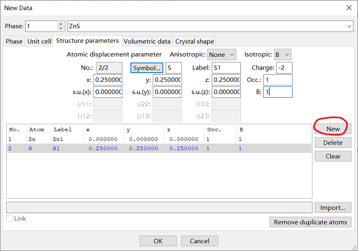 增加原子操作是在“Edit Data”选项卡中的“Structure parameters”页面进行的,如图20所示,单击“New”并输入原子参数就可增加原子,结果如图21所示。如果先选中已有的原子,则可以对原子位置进行调整。