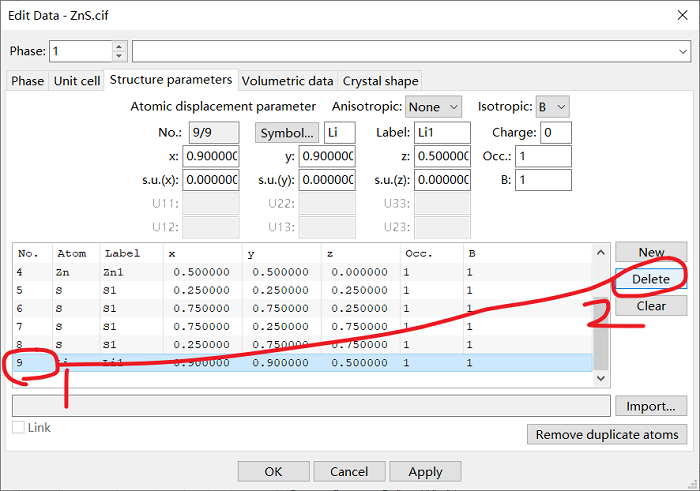 (2)表观删除:如图23,选中原子,按下Delete即可。此时原子仅仅不显示,进入“Edit Data”选项卡中的“Structure parameters”页面可以发现原子还是存在的(图24),再次点击Appy就可以重新显示出来。