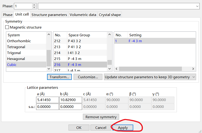 步骤3:选择对称性信息并输入点阵参数,如图8所示;