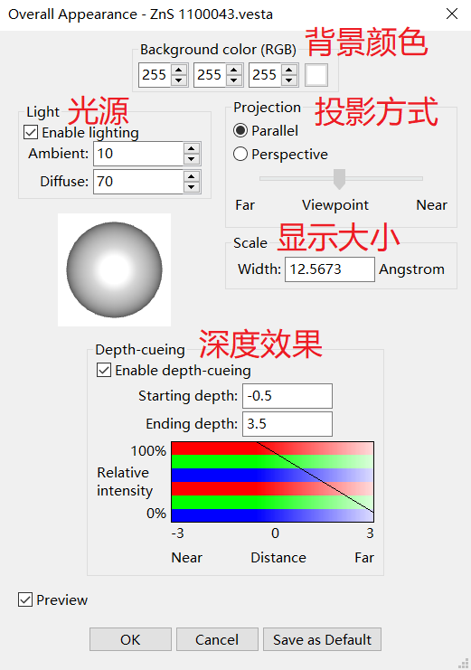 如图29,通过“View”→“Overall Appearance”即可打开如图30所示的总体外观调整界面,在这里我们可以对绘图窗口图形的总体外观进行调整,包括背景颜色,投影方式,深度效果等重要参数。