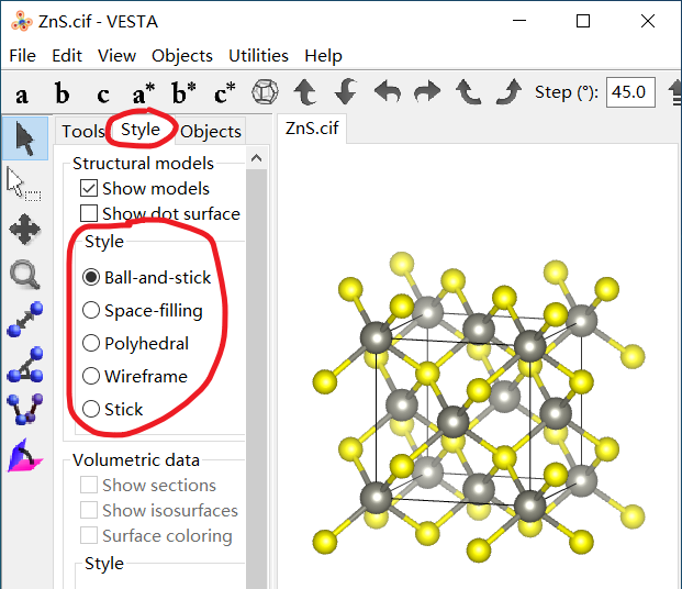 如图31,我们可以在副面板中通过Style来改变晶体结构的显示方式,总共有五种类型(图32)。