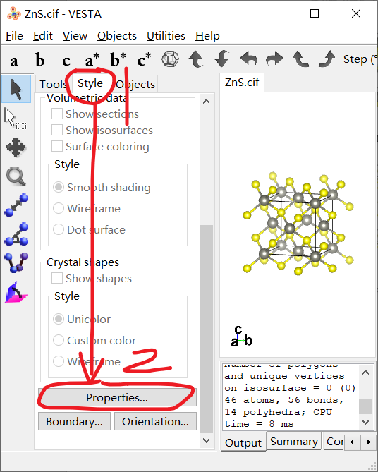 晶体结构中的晶胞边框、原子大小与颜色、键和多面体等显示特性都可以在“Properties”界面中进行调整(图33),我们可以在副面板中单击“Properties”来调出它(图34)。