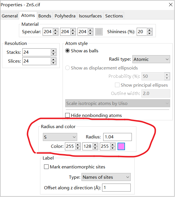 如图37,在Atoms页面,我们就可以对原子的大小和颜色等各种性质进行调整。