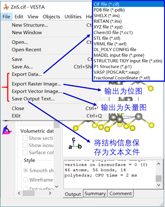 在我们建立、修改并美化好晶体结构之后,我们就可以按照图43的方式将结果输出,除了可以将结果保存为各种数据文件之外,最重要的是将其保存为图片。VESTA软件绘制的图形既可以保存为“位图”也可以保存为“矢量图”,一般我们是选择保存为“位图”。