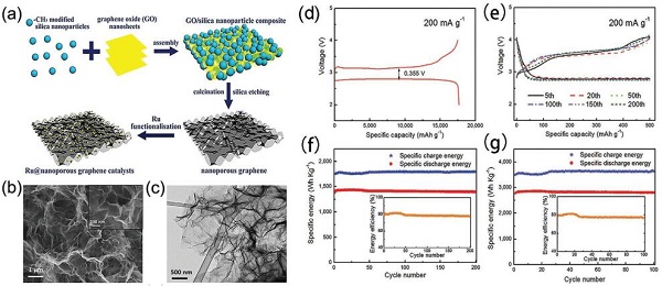 (a)多孔石墨烯和Ru-官能化的纳米多孔石墨烯结构的合成示意图;