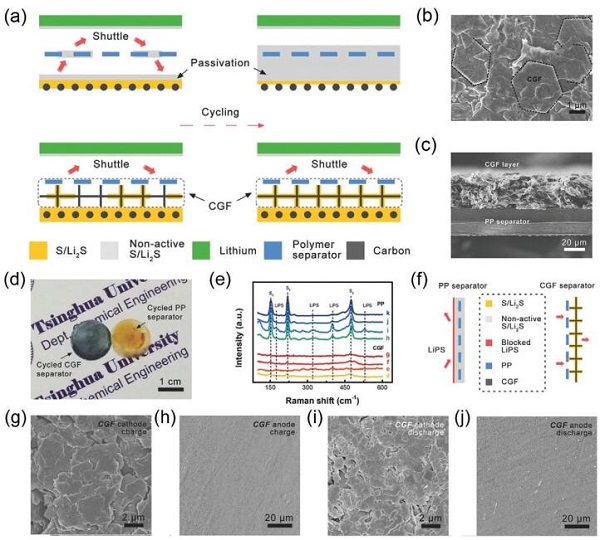 (g-h)充电状态下,循环后CGF隔膜的SEM图;