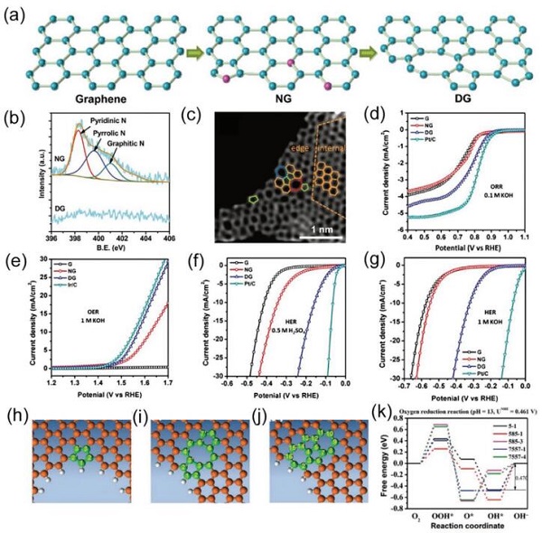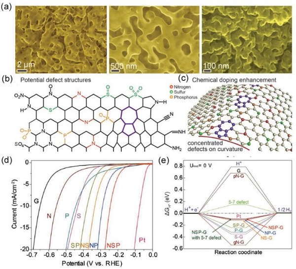 (b)氮、硫、磷掺杂的纳米孔石墨烯的可能缺陷结构;