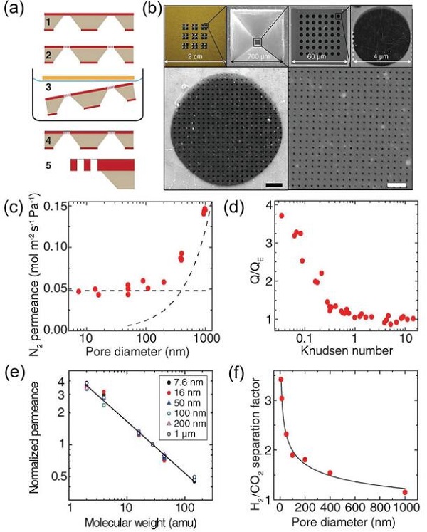 (e)通过具有不同孔径石墨烯薄膜的N2渗透率对气体渗透性进行归一化;