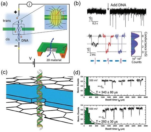 (c)研究850 bp dsDNA易位的石墨烯-介电石墨烯薄膜的示意图;