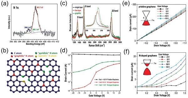(e-f)原始石墨烯和N-掺杂石墨烯场效应晶体管(FET)器件在各种Vg值下的Ids/Vds特性。
