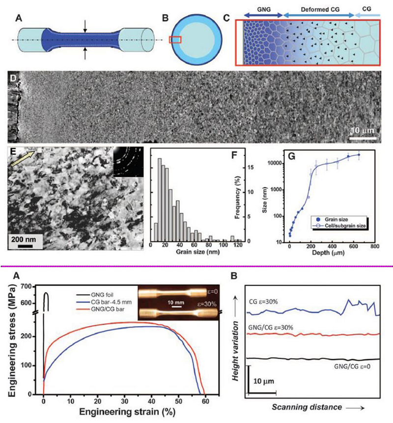 B和C拉伸实验的横截面部分,暗蓝色为梯度纳米层,蓝色为粗晶变形层,青蓝色为粗晶基体层;D为横截面的SEM照片;E为横截面的透射明场像;F表层5-mm深度中TEM测量的横向粒度分布;G平均晶粒大小随深度的变化(为粉线以上的图);A粗晶铜和梯度纳米晶铜准静态拉伸工程应力-应变曲线;B:粗晶铜和梯度纳米晶铜拉伸前后测量的表面高度变化曲线