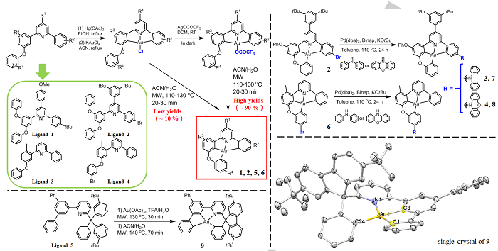 结构稳定的金(III)发射体具有强大的材料应用前景,但对于那些显示热激活延迟荧光(TADF)的发射体来说是罕见和前所未有的。在这项工作中,支志明 教授等人通过微波辅助C-H键激活,开发了一种新的合成路线,可以制备具有5-5-6元螯合环的高发射,电荷中性四配位[C^C^N^C]金(III)配合物。这些配合物显示出高的热稳定性,通过改变C^C^N^C配体的取代基来调节发射源(3IL、3ILCT和TADF)。以吩恶嗪/二苯胺取代基,制备了第一个四配位金(III)-TADF发射器,其发射量子产率高达94%,发射寿命降至0.62us。在真空沉积的OLEDs中表现出良好的性能,最高可达25%的EQEs最高可达25%,在100 cd m-2,LT95 达到5280 h。相关研究以“Tetradentate Gold(III) Complexes as Thermally Activated Delayed Fluorescence (TADF) Emitters: Microwave-Assisted Synthesis and High-Performance OLEDs with Long Operational Lifetime”为题,发表在Angew.上。
