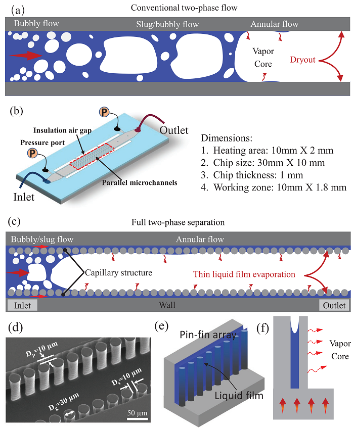 发展更小、更快、更强大的电子设备需要有效的冷却策略来有效地去除更多的热量。沸腾、蒸发等相变传热以其高效的传热方式在各种水能行业中得到了广泛的应用。尽管已经取得了广泛的进展,但由于多相流动的高度过渡性和混沌性,以及边界层结构的不利,流动沸腾的物理极限仍然具有挑战性。王钻开教授提出了一种接近流动沸腾传热物理极限的新方法。介绍了一种多通道流动沸腾装置,该装置的特点是采用了微型栅栏结构,从根本上改变了边界层结构,并在高热流条件下显著提高了传热系数,这种情况下由于从出口区域开始干化的发展和严重的两相流动不稳定性,会导致沸腾传热的恶化。此外,在不提高压降的情况下,达到了物理极限。相关研究以“Supercapillary Architecture-Activated Two-Phase Boundary Layer Structures for Highly Stable and Effcient Flow Boiling Heat Transfer”为题目,发表在AM上。