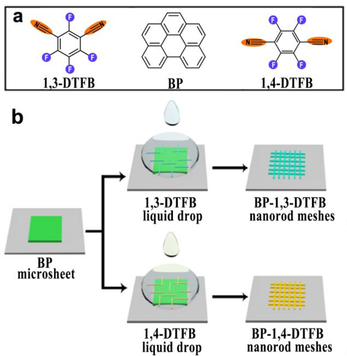 与具有随机取向的单个纳米棒相比,纳米棒阵列具有较大的表面积,可定制的密度和特定的取向,因此具有显著增强的光电性能。但由于较大的结构复杂性,二维(2D)有机纳米棒超结构的合理合成仍未解决。有鉴于此,黄维扬教授联合天津大学Yilong Lei等人通过一种简单的晶体转变策略,制备了由苯并芘(BP)和四氟间苯二腈(1,3-DTFB)构成的二维(2D)纳米棒网格。开发了一种合理合成有机纳米棒网格的晶体转换策略,其中预先存在的二维微片作为牺牲模板,允许纳米棒外延生长。这种转变是由电子D/A对之间的分子间相互作用驱动的。理想的二维微晶片和一维共晶纳米棒之间的晶格匹配可以形成纳米棒阵列。通过对电子受体的精心选择,可以很容易地得到具有不同发光度的二维纳米棒网格。相关研究以“Epitaxial Growth of Nanorod Meshes from Luminescent Organic Cocrystals via Crystal Transformation”为题目,发表在JACS上。