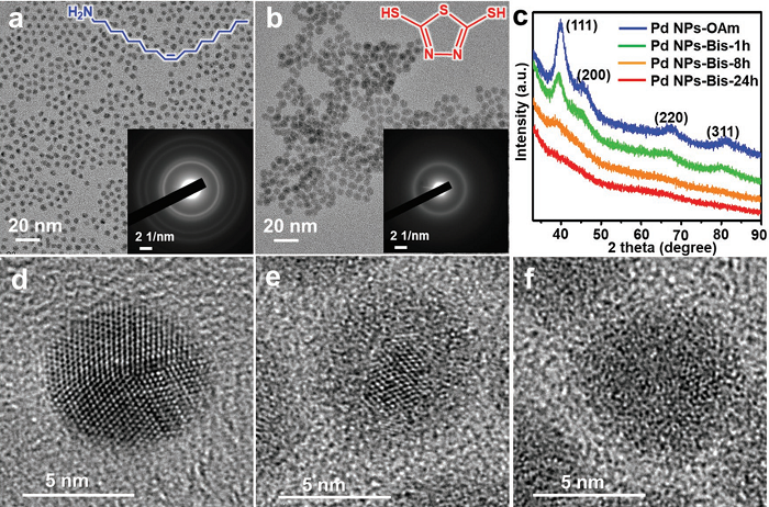 Pd NPs-OAm、Pd NPs-Bis-24h的TEM、配体交换XRD及HRTEM图像