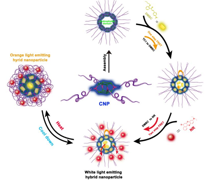 由于荧光探针具有良好的细胞相容性、易读性和高分辨率等特点,因此开发一种用于活细胞温度检测的荧光探针具有一定的意义和挑战性。在此,唐本忠教授成功地合成了能在水溶液中组装成纳米颗粒的发射型笼状有机温度敏感聚合物。通过封装不同剂量的客体DMBC和NR染料和FRET效应获得的纳米颗粒可以很容易地调整为全色发射(包括白光发射),温度分辨率至少为0.5℃。此外,白光发射聚合物杂化纳米颗粒对温度具有可逆的抑制反应,其荧光颜色在白色和橙色发射之间变化,具有良好的细胞相容性,可作为活细胞温度传感探针。相关研究以“Ligand-Exchange-Induced Amorphization of Pd Nanomaterials for Highly Efficient Electrocatalytic Hydrogen Evolution Reaction”为题目,发表在JACS上。