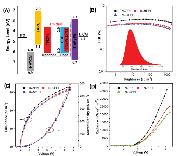 开发高效的有机深/近红外红(DR/NIR)发光体具有理想的光致发光量子产率(PLQYs)和令人满意的激子利用效率(EUEs)仍然是一个挑战,唐本忠教授等人合成了以naphtho[2,3-c][1,2,5]thiadiazole(NZ)为底物的三种新的DR/NIR发光体 (TNZPPI, TNZtPPI,TNZ2tPPI),对含有调谐局部激发态(LE)和CT分量的杂化激发态进行了表征,并发现有效的高能级反向跨系统通道(RISC)可能由于其更大的T2-T1能量间隙和更小的T4-S2能量分裂而被激活。由于它们在薄膜中具有更高的荧光量子产率(24-38%),基于TNZPs基的非掺杂器件具有明亮的近红外辐射,最大辐射强度为21447-36027 mW Sr−1 m−2,其性能优于大多数报道的纯有机近红外器件。研究深入分析了它们的溶剂化效应和聚合诱导发射(AIE)活性,制备了掺杂有机发光二极管(OLEDs),其性能优良。研究结果表明,分子结构和分子间相互作用的电子效应都与其性能有关,这对设计高效的NZ基OLED材料具有重要意义。相关研究以“Exploration of High Effciency AIE-Active Deep/NearInfrared Red Emitters in OLEDs with High-Radiance”为题目,发表在Adv. Optical Mater.上。