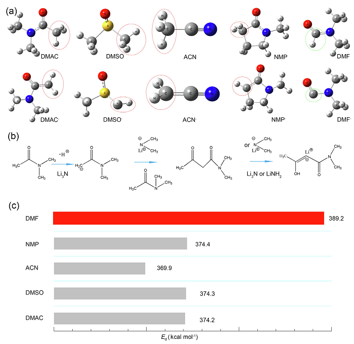 氮化锂是一种极好的零残留正极预锂化添加剂,可用于弥补锂离子电容器及锂离子电池在首圈的锂损失。但是,在电极制造过程中,氮化锂与非质子极性溶剂的相容性差,与N-甲基-2-吡咯烷酮(NMP)等常用溶剂具有很高的反应性,限制了以氮化锂作为预锂添加剂的技术推广应用。中科院大连化物所李先锋、张洪章等人通过商业上可用的匀浆涂布途径制备了含氮化锂的电极,使用 DMF作为匀浆溶剂,实验分析和DFT模拟证实了DMF的分子稳定机理,DMF的脱氢能明显大于其他常用溶剂。添加20%氮化锂的软包装锂离子电容器具有出色的倍率性能、循环稳定性和超高的能量密度,其能量密度是不含Li3N器件的2.3倍,1万次充放电循环后,其能量保持率高达90%。相关研究以“DMF stabilized Li3N slurry for manufacturing self-prelithiatable lithium-ion capacitors”为题目,发表在Science Bulletin上。