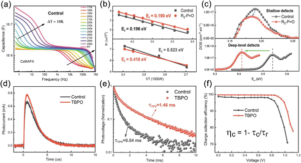 f)由光电流和光电压衰减寿命得出电池的偏压~电荷收集效率(ηC)关系。TBPO钝化电池在高偏压下的ηC更高。