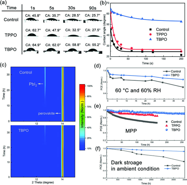 c)TBPO钝化和非钝化钙钛矿膜的原位X射线衍射图。