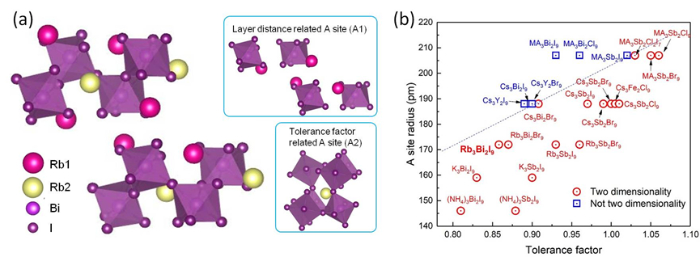 图1. (a)A3B2X9的晶体结构和原子构型,其中A可以是K+,Rb+,Cs+,NH4+和CH3NH4+,B可以是Sb3+,Bi3+和Y3+,X可以是Cl–,Br–和I–;(b)A3B2X9钙钛矿的判据。总结了A3B2X9钙钛矿的A位半径与容差因子的关系。