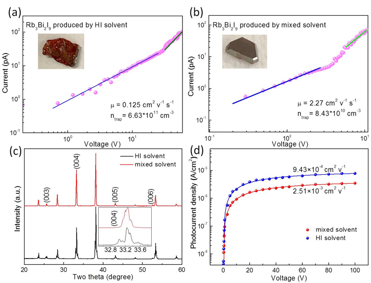 图3 (a)HI溶液和(b)HI和H2O(体积比1:1)的混合溶液作为溶剂制得的Rb3Bi2I9单晶的I-V曲线,曲线通过空间电荷限制电流(SCLC)模型拟合;(c)通过混合溶液和HI溶液制备的Rb3Bi2I9单晶的XRD图谱和(d)电压依赖的光电流密度。