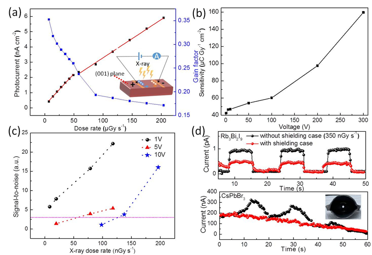 图4 (a)光电流和增益因子与X射线剂量率的关系,插图是平面结构的器件示意图;(b)优化后的Rb3Bi2I9单晶在不同电压下的X射线灵敏度;(c)器件的测试信噪比,虚线代表信噪比为3;(d)当在探测器和X射线源之间插入Pb屏蔽盒时,CsPbBr3和Rb3Bi2I9单晶X射线探测器的响应,剂量率为350 nGyair s-1。
