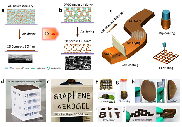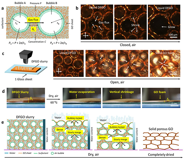 图一、发泡氧化石墨烯浆料直接干燥制备三维多孔材料(a)空气中干燥氧化石墨烯(GO)水系浆料制备2D致密膜材料;