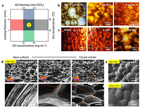 (d)通过改变加热方向(红色箭头)和DFGO浓度可以实现GO泡沫从不均的开孔结构向均匀的闭孔结构转变;