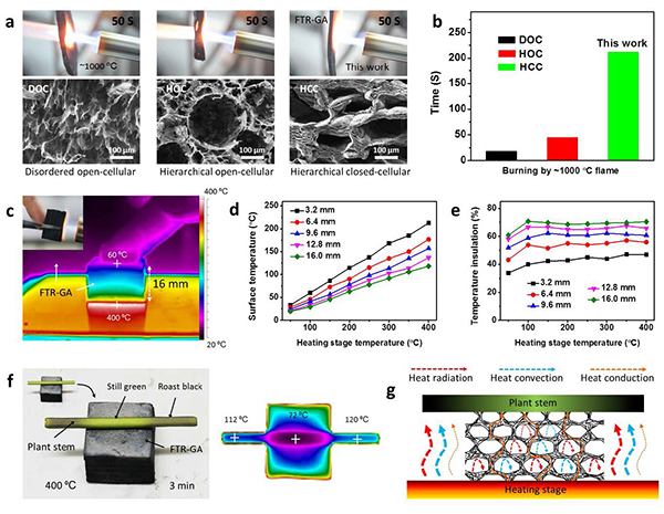 (f)FTR-GA样品放在400℃热台上,其表面放上绿萝茎部,可以看到超出的部分被烤成黑色,表明该材料可以有效阻隔强热对流和热辐射,热成像图验证了该结论;