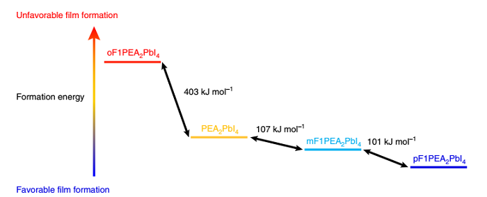 为了探究不同有机阳离子在钙钛矿形成过程中的形成能差异,作者结合密度泛函理论(DFT)的计算,发现的形成能的差异与化合物的排列变化有很好的关系,4-氟苯乙胺(pF1PEA)具有更有小的形成能和更少的晶体无序,2-氟苯乙胺(oF1PEA)具有较大的形成能和更多的晶体无序,所以较少的形成能有利于晶体的有序生长,更有利于提高器件性能。