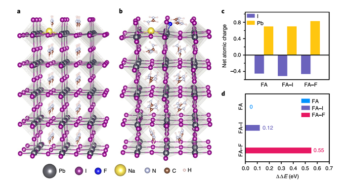 北京大学的周欢萍教授5团队将NaF加入钙钛矿中,探究钠离子和氟离子对钙钛矿的影响。为了研究了钙钛矿中NaF的位置及其对钙钛矿稳定性的影响,作者使用DFT计算钠离子的相对能量,计算结果表面钠离子在钙钛矿的表面上比在钙钛矿的体相内更稳定,值差为0.2 ~ 0.3 eV;另外通过DFT计算氟离子的相对能量以及在钙钛矿中的位置,发现将氟离子合并到钙钛矿晶格中是非常难,而且它强烈倾向于呆在表面。氟离子最有利的位置要么是在碘化铅的表面上取代碘离子,要么是在钙钛矿体的体相里。而且,通过DFT在钙钛矿进行构象模拟发现,在FAI表面氟离子的掺入改变了表面和次表面层的局部结合。最终导致氟位点周围的阳离子重新朝向氟离子,从而使它们与氟离子的相互作用最大化。