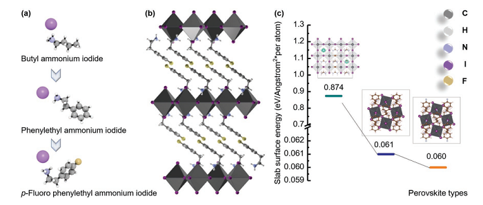 a)形成钙钛矿的三种不同铵盐的示意图; b)沿b轴的FPEA2PbI4; c)平板表面能以能级的形式表示。从左至右,平板模型分别为3D CsMAFA钙钛矿、PEA2PbI4、FPEA2PbI4。