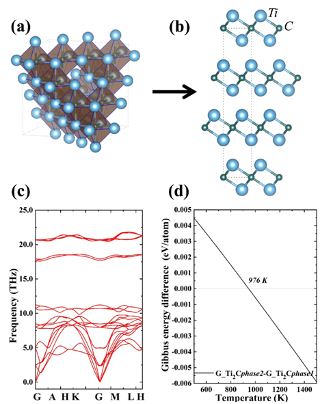 图1. (a)和(b)Ti2C的两种相结构;(c)Ti2C MXene相的声子图;(d)两种相的自由能。