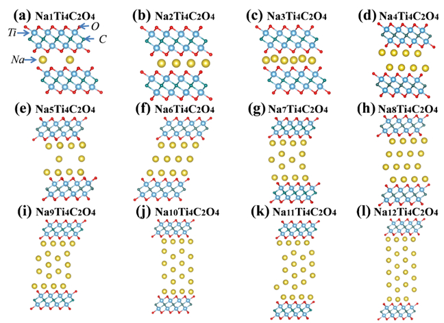 通过图2中USPEX全局搜索,在MXene相Ti4C2O4中插入不同数量的钠离子,得到一系列最稳定结构。随着钠的数量增加,MXene层状结构始终存在,没有被破坏。随着钠的插入,层间隙被撑大,大量的钠离子以多层堆叠的形式,储存于层间。具体晶格参数 如表1,所示。