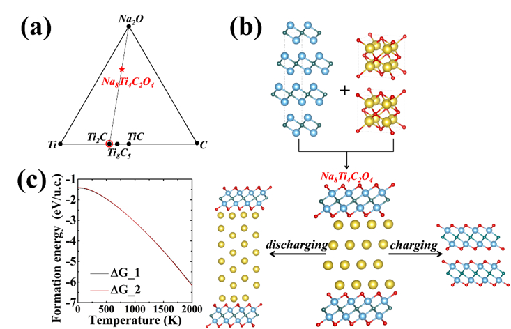 图4. (a)Na8Ti4C2O4的合成相图;(b)Ti2C和Na2O为基础的Na8Ti4C2O4及其它化合物的合成结构示意图;(c)以两种结构的Ti2C和Na2O为基础的Na8Ti4C2O4的形成能。