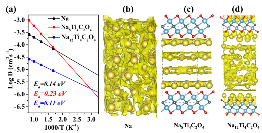 图6. AIMD分子动力学计算(a)钠离子在Na、Na8Ti4C2O4、Na12Ti4C2O4中的扩散系数;(b)钠离子在Na、Na8Ti4C2O4、Na12Ti4C2O4中的轨迹。