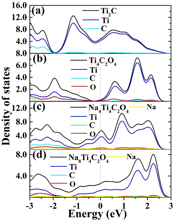 图7. 电子状态密度DOS(a)Ti2C;(b)Ti4C2O4;(c)Na4Ti4C2O4;(d)Na8Ti4C2O4。