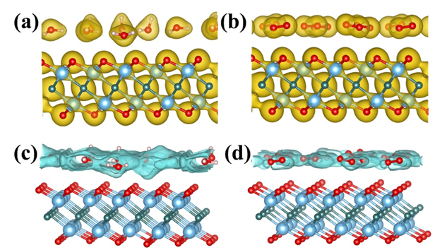 图8.(a)H2O和(b)O2 在Ti4C2O4表面的电荷密度分布;相应的AIMD轨迹(a)H2O和(b)O2。