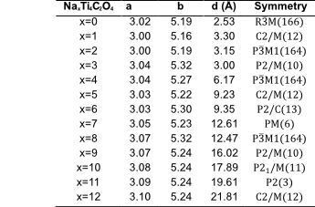 表1. NaxTi4C2O4 (0≤x≤12)的晶格参数(a,b)和层间距(d)