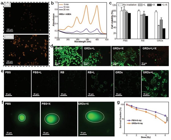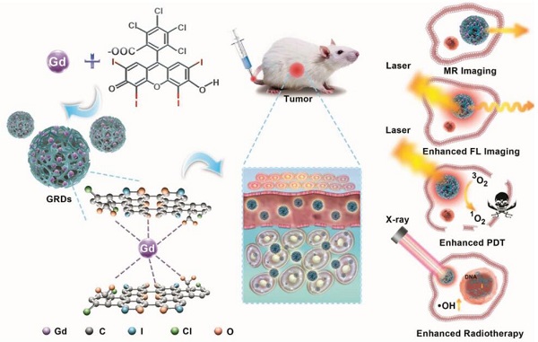 综上所述,研究人员通过一步溶剂热法,利用Gd(III)、临床光敏剂RB制备了一种配合物纳米点-GRDs。相对于RB,制备的GRDs表现出独特的吸收,显著增强的荧光量子产率和单线态氧产率,得到良好的体内外荧光成像和PDT效果。Gd(III)与RB分子之间的有效配位提高了其掺杂率,使得GRDs具有更好的T1加权MR成像能力和放疗增敏效应。此外,GRDs具有良好的生物相容性和生物安全性,可以将PDT效应与X射线照射下的放射增敏作用相结合,进而更加高效地杀死癌细胞。体内研究表明,通过MR/荧光成像实时监测,GRDs可通过EPR效应在肿瘤处积聚,显示出优异的抗肿瘤性能。