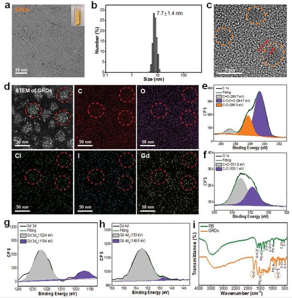 (e-h)GRD的XPS能谱:C 1s峰(e)、O 1s峰(f)、Gd 3d峰(g)、Gd 4d峰(h);