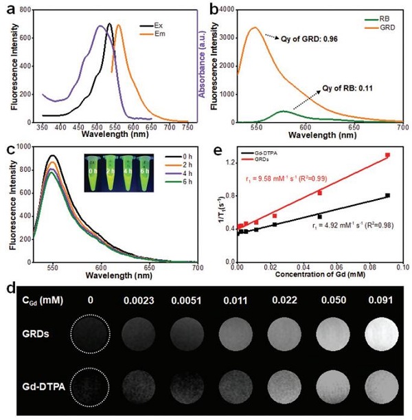 (d-e)利用9.4 T MRI系统测定的GRDs和Gd-DTPA的T1加权MR图像(d)和r1弛豫率(e)。