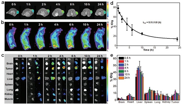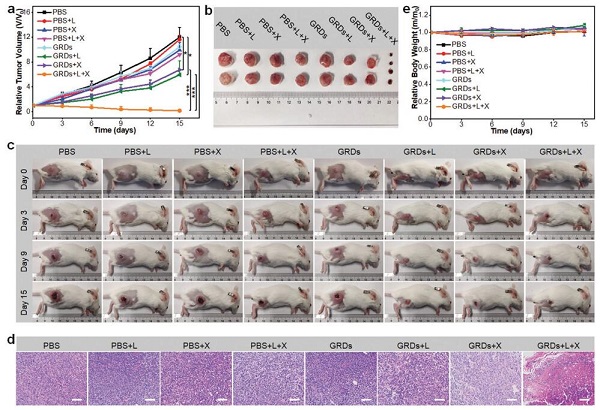 (e)静脉注射GRDs后,GRDs在4T1荷瘤小鼠中的生物分布。
