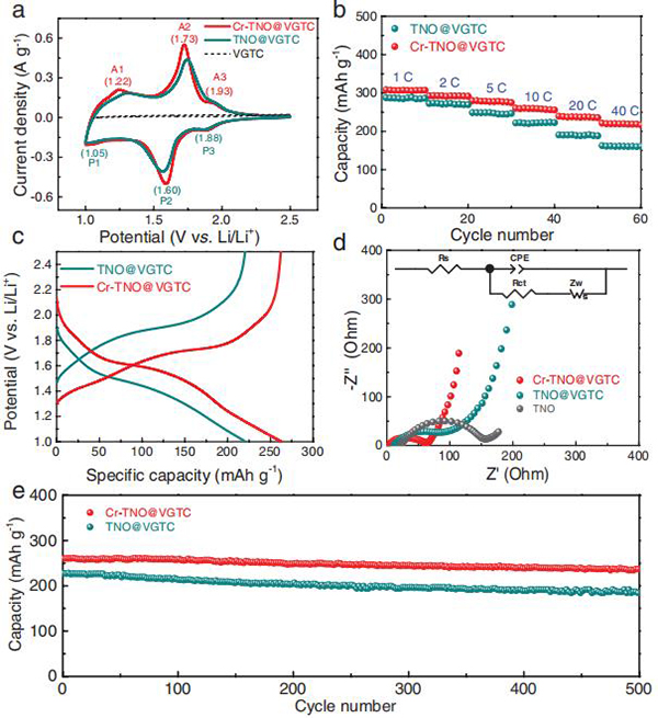 (b)TNO @ VGTC和Cr-TNO @ VGTC电极的倍率性能。