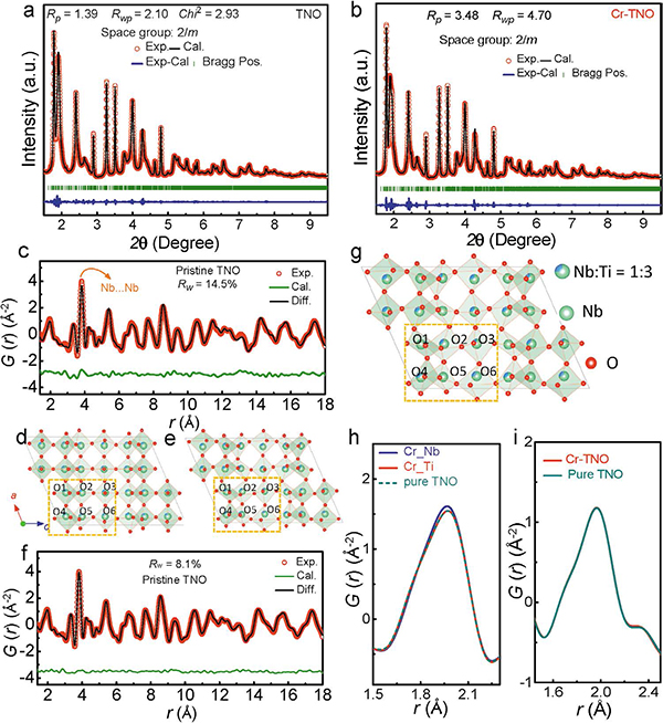 (f)基于Nb/Ti部分有序结构模型的纯TNO纳米粒子的XRD精修谱图。