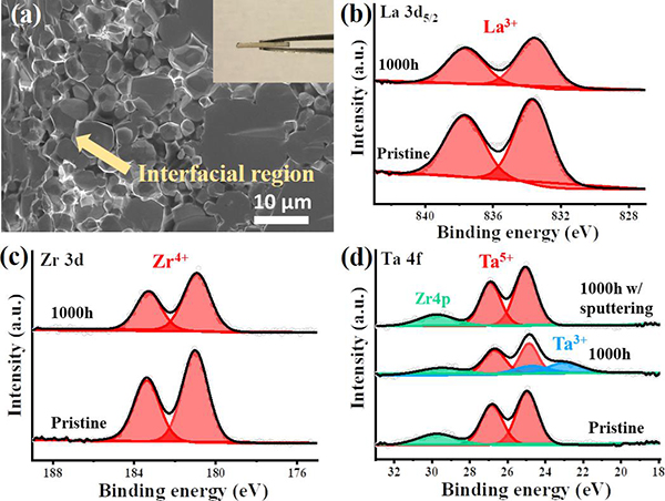 (a)在Li | Li电池中以0.5 mA/cm2-1 mAh/cm2的条件循环1000小时后,具有ZNR界面的LLZTO颗粒的横截面SEM图像。